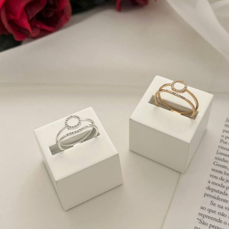 Anel duas fileiras, uma reta e outra com um círculo. Com um design atemporal e cravejado com zircônias brilhantes, este anel combina luxo e modernidade, tornando-se um acessório essencial para complementar qualquer look.