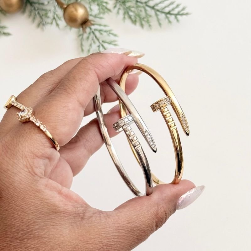 Um acessório moderno, estiloso e super marcante. O bracelete estilo prego com detalhes cravejados traz aquele brilho sofisticado que transforma qualquer look. Ele une elegância e atitude em uma única peça, perfeito para usar sozinho ou combinado com outros acessórios.