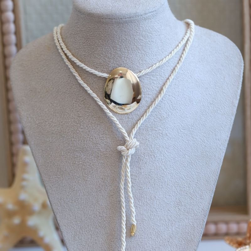 Elegante e impacto em uma única peça. Colar com cordão torcido em tom neutro e medalhão oval dourado com acabamento espelhado, que traz sofisticação e presença ao look. ideal para quem ama acessórios marcantes e cheio de estilo. Ótimo para compor looks de verão.