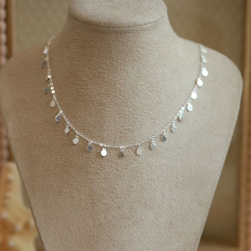 Delicada, moderna e cheia de movimento. Essa choker é composta por uma corrente fina de elinhos com medalhinhas lisas penduradas, que refletem a luz e dão um charme especial ao look.