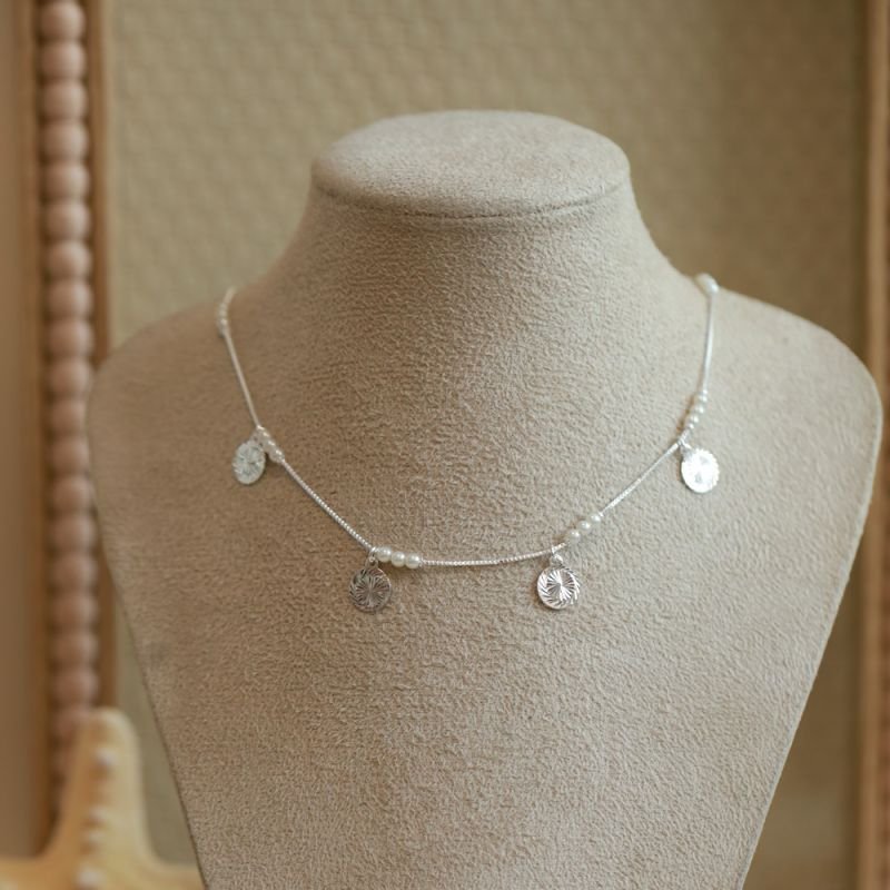 Delicada na medida certa e cheia de charme. Essa choker traz uma corrente veneziana, intercalada com pérolas clássica e medalhas texturizadas, criando um visual elegante e moderno ao mesmo tempo.