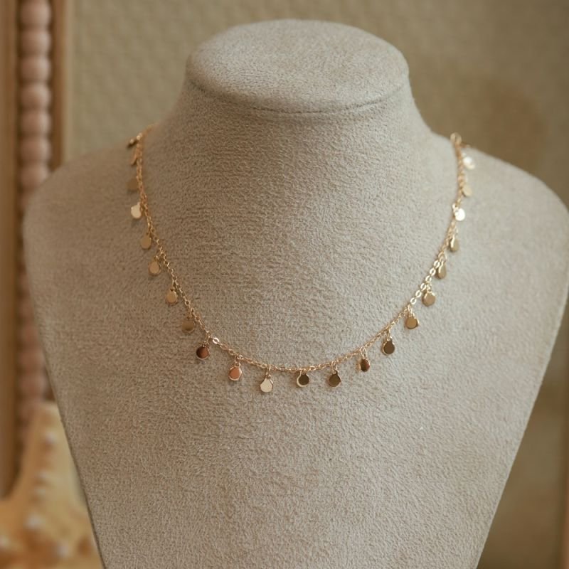 Delicada, moderna e cheia de movimento. Essa choker é composta por uma corrente fina de elinhos com medalhinhas lisas penduradas, que refletem a luz e dão um charme especial ao look.