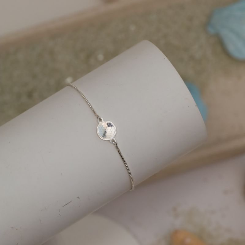 Delicada e atemporal, essa pulseira traz um círculo central com acabamento diamantado que reflete a luz de forma elegante. O design fino e sofisticado é perfeito para usar sozinha ou em mix com outras pulseiras, elevando qualquer look.