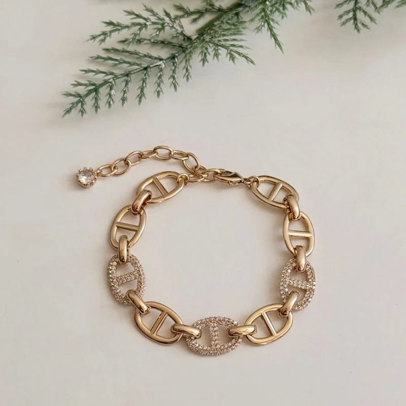 A pulseira perfeita para quem ama estilo e presença. Combinando elos lisos e elos cravejados em zircônias, essa peça traz um contraste moderno e sofisticado que ilumina o pulso.