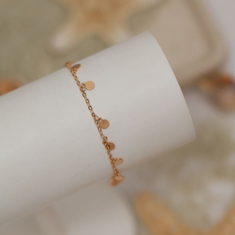 Delicada, moderna e cheia de movimento. Essa pulseira é composta por uma corrente fina de elinhos com medalhinhas lisas penduradas, que refletem a luz e dão um charme especial ao look.