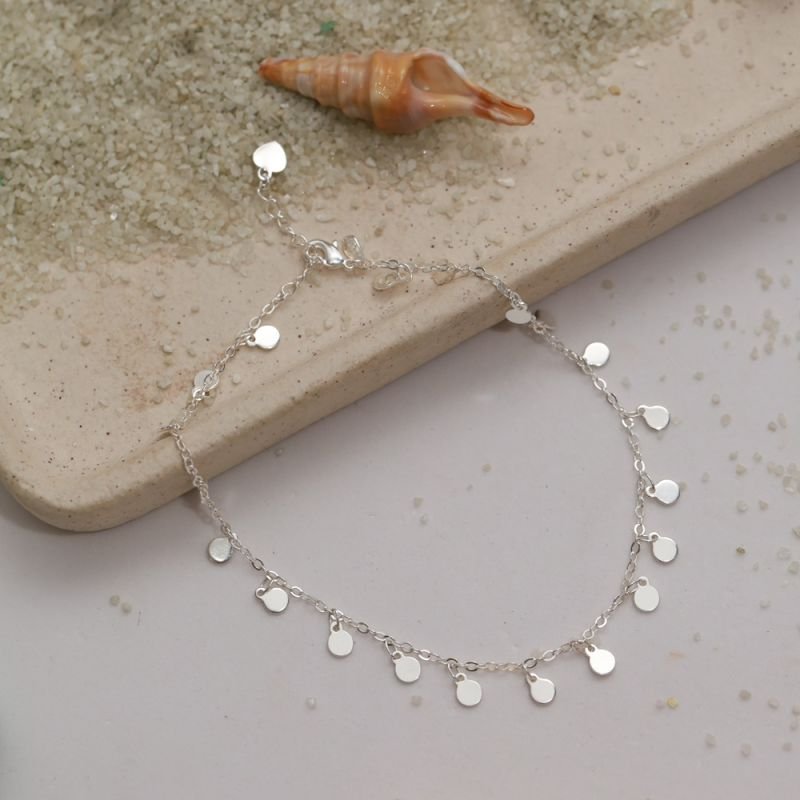 Delicada, moderna e cheia de movimento. Essa tornozeleira é composta por uma corrente fina de elinhos com medalhinhas lisas penduradas, que refletem a luz e dão um charme especial ao look, combinando elegância e romantismo na medida certa.